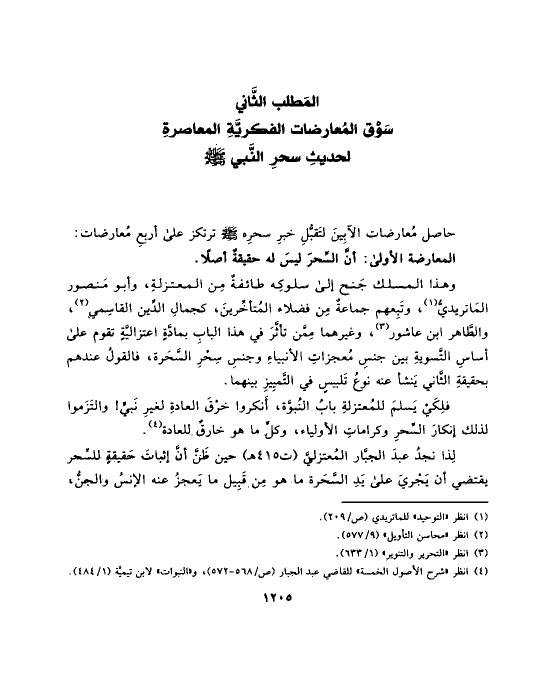 وهذا المسلك جَنح إلى سلوكِه طائفةٌ مِن المعتزلةِ، وأبو مَنصور المَاتريديُّ (¬١)، وتَبِعهم جماعةٌ مِن فضلاء المُتأخِّرينَ، كجمالِ الدِّين القاسِمي (¬٢)، والطَّاهر ابن عاشور (¬٣)، وغيرهما مِمَّن تأثَّرَ في هذا البابِ بمادَّةٍ اعتزاليَّةٍ تقوم على أساسِ التَّسويةِ بين جنسِ مُعجزاتِ الأنبياءِ وجنسِ سِحْرِ السَّحَرة، فالقولُ عندهم بحقيقةِ الثَّاني يَنشأ عنه نوعُ تَلبيسٍ في التَّميِيزِ بينهما.