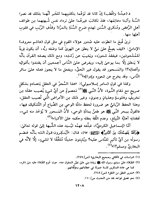 وكذا في قولِ (سامر إسلامبولي): «هذا السِّحرُ في العقلِ يَتصادم بشكلٍ صريحٍ مع مَقامِ النُّبوة، لأنَّ النَّبي صلى الله عليه وسلم (¬٢) مَعصومٌ عن أيِّ شيءٍ يُصيب عقلَه مِن تخريفٍ وهَلوسةٍ وهذيانٍ وجنونٍ، وغير ذلك مِن الأمراض الَّتي تُصيب العقل، وهذا الحفظ الرَّبانيُّ هو ضرورة لحفظ مادَّة الوحيِ مِن الضَّياع أو التَّشكيك فيها، فالقولُ بسِحر النَّبي صلى الله عليه وسلم هو طعنٌ بمادَّةِ الوحي، لأنَّ المَسحور لا يُؤخَذ منه شيء، لفقدانِه أهليَّة التَّبيلغ، وعدم الثِّقة بعقله وحكمه على الأشياء» (¬٣).