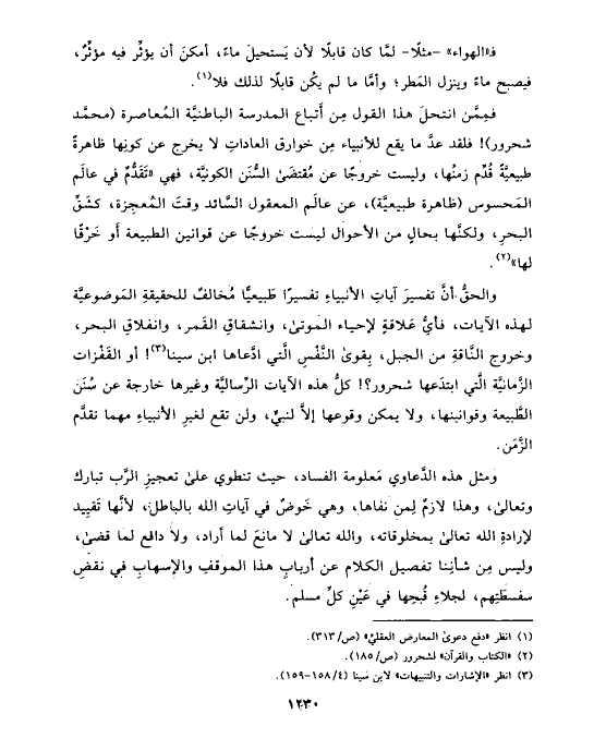 والحقُّ أنَّ تفسيرَ آياتِ الأنبياءِ تفسيرًا طَبيعيًّا مُخالفٌ للحقيقةِ المَوضوعيَّة لهذه الآيات، فأيُّ عَلاقةٍ لإحياء الموتى، وانشقاقِ القَمر، وانفلاقِ البحر، وخروج النَّاقةِ من الجبل، بِقوى النَّفْسِ الَّتي ادَّعاها ابن سينا (¬٣)! أو القَفْزات الزَّمانيَّة الَّتي ابتدَعها شحرور؟! كلُّ هذه الآيات الرِّساليَّة وغيرها خارجة عن سُنَن الطَّبيعة وقوانينها، ولا يمكن وقوعها إلَاّ لنبيٍّ، ولن تقع لغيرِ الأنبياءِ مهما تقدَّم الزَّمَن.