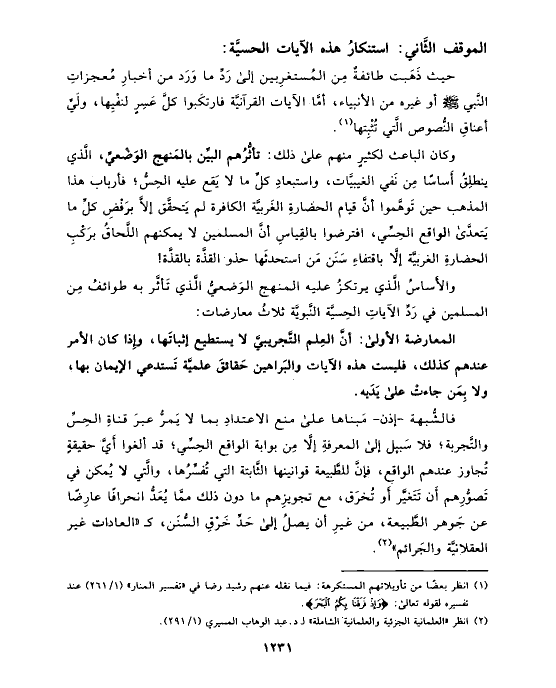 فالشُّبهة -إذن- مَبناها على منع الاعتدادِ بما لا يَمرُّ عبرَ قناةِ الحِسِّ والتَّجربة؛ فلا سَبيل إلى المعرفةِ إلَّا مِن بوابة الواقع الحِسِّي؛ قد ألغوا أَيَّ حقيقةٍ تُجاوز عندهم الواقع، فإنَّ للطَّبيعة قوانينها الثَّابتة التي تُفسِّرُها، والَّتي لا يُمكن في تَصوُّرِهم أَن تَتَغيَّر أَو تُخرَق، مع تجويزِهم ما دون ذلك ممَّا يُعَدُّ انحرافًا عارِضًا عن جَوهر الطَّبيعة، من غيرِ أن يصلُ إلى حَدِّ خَرْقِ السُّنَن، كـ «العادات غير العقلانيَّة والجَرائم» (¬٢).
