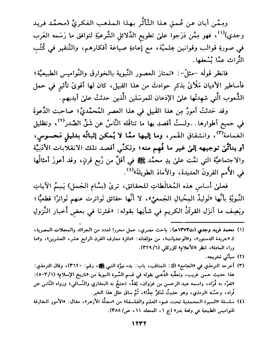ومِمَّن أبان عن عُمقِ هذا التَّأثُّر بهذا المذهب الفكريِّ (محمَّد فريد وجدي) (¬١)، فهو مِمَّن دَرَجوا على تطويعِ الدَّلائلِ الشَّرعيَةِ لتوافق ما رَسَمه الغَرب في صورةِ قوالب وقوانين عِلميَّة، مع إعادةِ صياغة أفكارهم، والتَّنقير في كُتُبِ التُّراث عمَّا يُسْعفها.