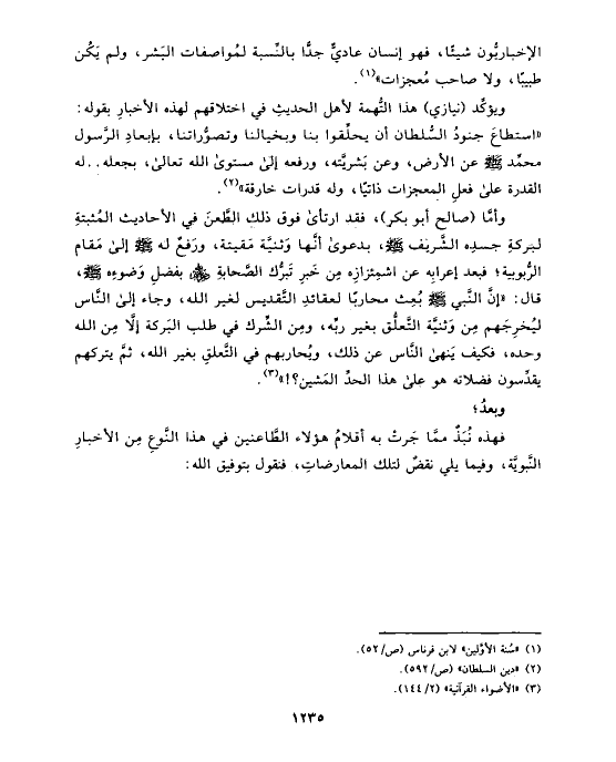 ويؤكِّد (نيازي) هذا التُّهمة لأهل الحديثِ في اختلاقهم لهذه الأخبارِ بقوله: «استطاعَ جنودُ السُّلطان أن يحلِّقوا بنا وبخيالنا وتصوُّراتنا، بإبعادِ الرَّسول محمِّد صلى الله عليه وسلم عن الأرض، وعن بَشريَّته، ورفعه إلى مستوى الله تعالى، بجعله .. له القدرة على فعلِ المعجزات ذاتيًا، وله قدرات خارقة» (¬٢).