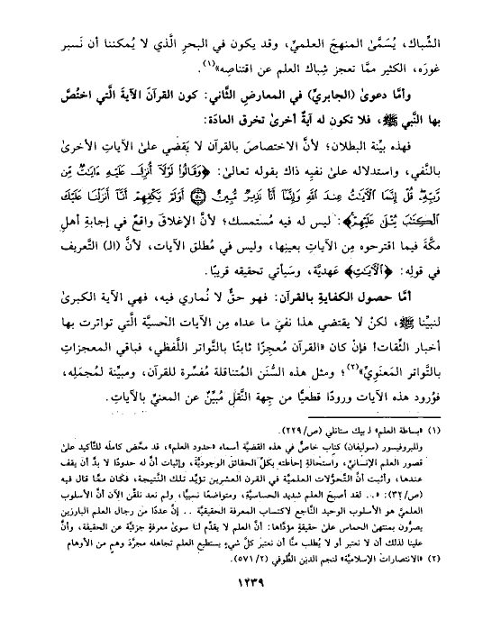فهذه بيِّنة البطلان؛ لأنَّ الاختصاصَ بالقرآن لا يَقضي على الآياتِ الأخرى بالنَّفي، واستدلاله على نفيِه ذاك بقوله تعالى: {وَقَالُوا لَوْلا أُنزِلَ عَلَيْهِ آيَاتٌ مِّن رَّبِّهِ قُلْ إِنَّمَا الآيَاتُ عِندَ اللَّهِ وَإِنَّمَا أَنَا نَذِيرٌ مُّبِينٌ (٥٠) أَوَلَمْ يَكْفِهِمْ أَنَّا أَنزَلْنَا عَلَيْكَ الْكِتَابَ يُتْلَى عَلَيْهِمْ}: ليس له فيه مُستمسك؛ لأنَّ الإغلاقَ واقعٌ في إجابةِ أهلِ مكَّةَ فيما اقترحوه مِن الآياتِ بعينِها، وليس في مُطلق الآيات، لأنَّ (الـ) التَّعريف في قولِه: {الآيَاتِ} عَهديَّة، وسَيأتي تحقيقه قريبًا.