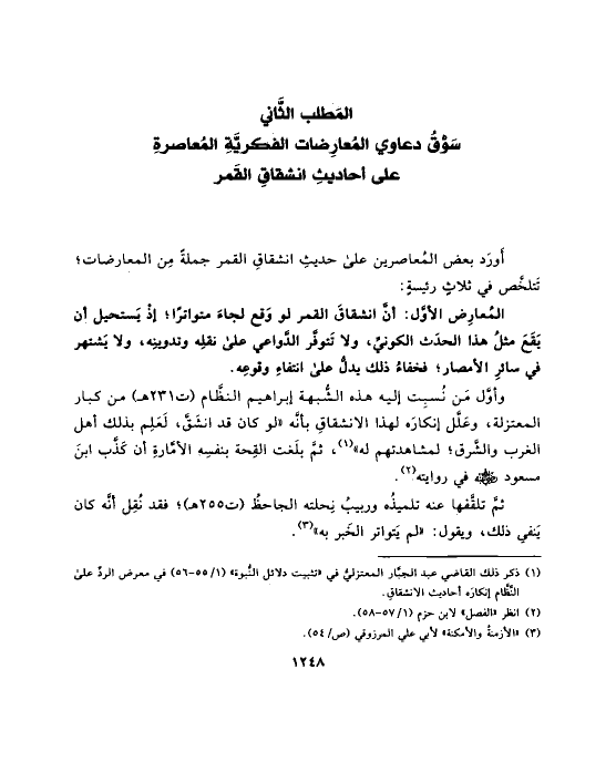 وأوَّل مَن نُسبِت إليه هذه الشُّبهة إبراهيم النظَّام (ت ٢٣١ هـ) من كبار المعتزلة، وعَلَّل إنكارَه لهذا الانشقاقِ بأنَّه «لو كان قد انشَقَّ، لَعَلِم بذلك أهل الغرب والشَّرق؛ لمشاهدتهم له» (¬١)، ثمَّ بلَغت القِحة بنفسِه الأمَّارةِ أن كَذَّب ابنَ مسعود رضي الله عنه في روايته (¬٢).