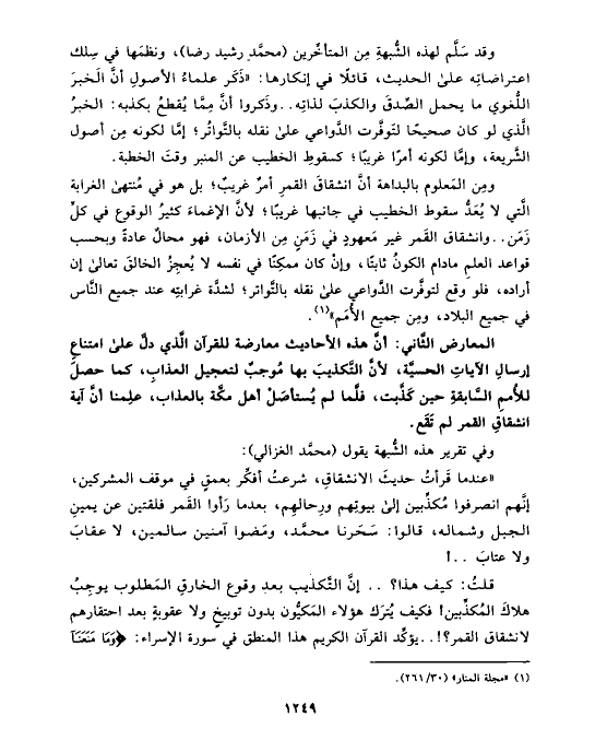 ومِن المَعلوم بالبداهة أنَّ انشقاقَ القمرِ أمرٌ غريبٌ؛ بل هو في مُنتهى الغرابة الَّتي لا يُعَدُّ سقوط الخطيب في جانبها غريبًا؛ لأنَّ الإغماءَ كثيرُ الوقوع في كلِّ زَمَن .. وانشقاق القَمر غير مَعهودٍ في زَمَنٍ مِن الأزمان، فهو محالٌ عادةً وبحسب قواعد العلمِ مادام الكونُ ثابتًا، وإنْ كان ممكِنًا في نفسه لا يُعجِزُ الخالقَ تعالى إن أراده، فلو وقع لتوفَّرت الدَّواعي على نقله بالتَّواتر؛ لشدَّة غرابتِه عند جميع النَّاس في جميع البلاد، ومِن جميع الأُمَم» (¬١).