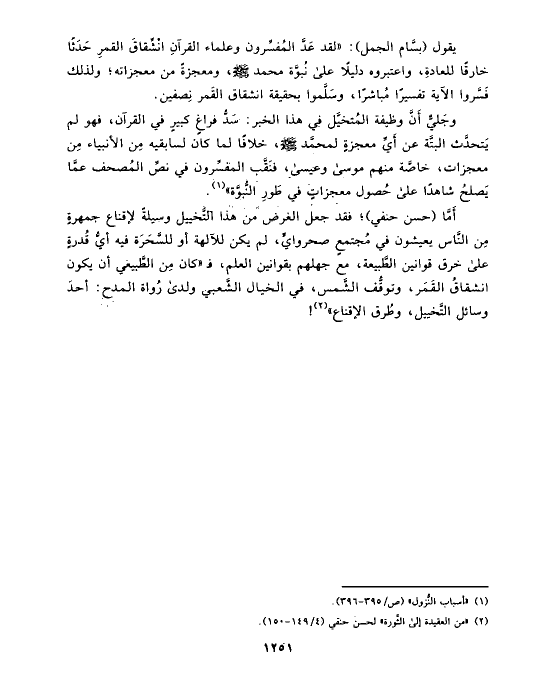 يقول (بسَّام الجمل): «لقد عَدَّ المُفسِّرون وعلماء القرآنِ انْشِّقاقَ القمرِ حَدَثًا خارقًا للعادةِ، واعتبروه دليلًا على نُبوَّة محمد صلى الله عليه وسلم، ومعجزةً من معجزاته؛ ولذلك فَسَّروا الآية تفسيرًا مُباشرًا، وسَلَّموا بحقيقة انشقاق القَمر نِصفين.