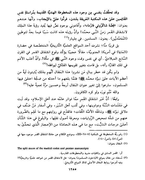 وقد تحقَّقتُ بنفسي مِن وجود هذه المخطوطة الهنديَّة القَديمة بمُراسلةِ نفسِ القَائِمين على هذه المكتبة العَريقة بلندن، فردُّوا عليَّ بالإيجاب، وأنَّها عندهم بعنوان: «قِصَّة شاكْرُوتي فارْماد»، وأَفَادوني بوجودِ نصٍّ فيها يُفيد رؤيةَ هذا الملِك لانشقاق القَمر زمنَ النَّبي محمَّد! وأنَّ رؤيتَه هذه كانت سَببًا فيما بعدُ لتوطينِ (المُحَمَّديِّين) ـ يعنون: المسلمين ـ في مِليبار! (¬١)