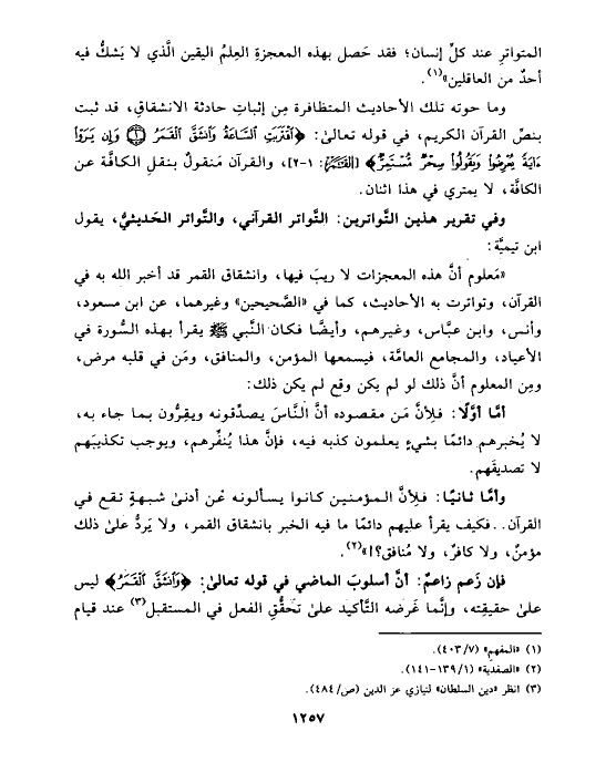 «مَعلوم أنَّ هذه المعجزات لا ريبَ فيها، وانشقاق القمر قد أخبر الله به في القرآن، وتواترت به الأحاديث، كما في «الصَّحيحين» وغيرهما، عن ابن مسعود، وأنس، وابن عبَّاس، وغيرهم، وأيضَّا فكان النَّبي صلى الله عليه وسلم يقرأ بهذه السُّورة في الأعياد، والمجامع العامَّة، فيسمعها المؤمن، والمنافق، ومَن في قلبه مرض، ومِن المعلوم أنَّ ذلك لو لم يكن وقع لم يكن ذلك: