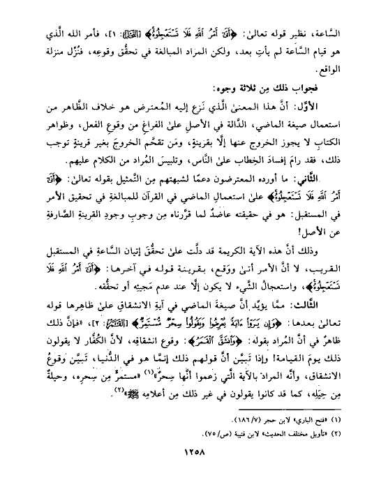 الثَّاني: ما أورده المعترضون دعمًا لشبهتهم مِن التَّمثيل بقوله تعالى: {أَتَى أَمْرُ اللَّهِ فَلَا تَسْتَعْجِلُوهُ} على استعمالِ الماضي في القرآن للمبالغةِ في تحقيق الأمر في المستقبل: هو في حقيقته عاضدٌ لما قرَّرناه مِن وجوبِ وجودِ القرينةِ الصَّارفةِ عن الأصل!