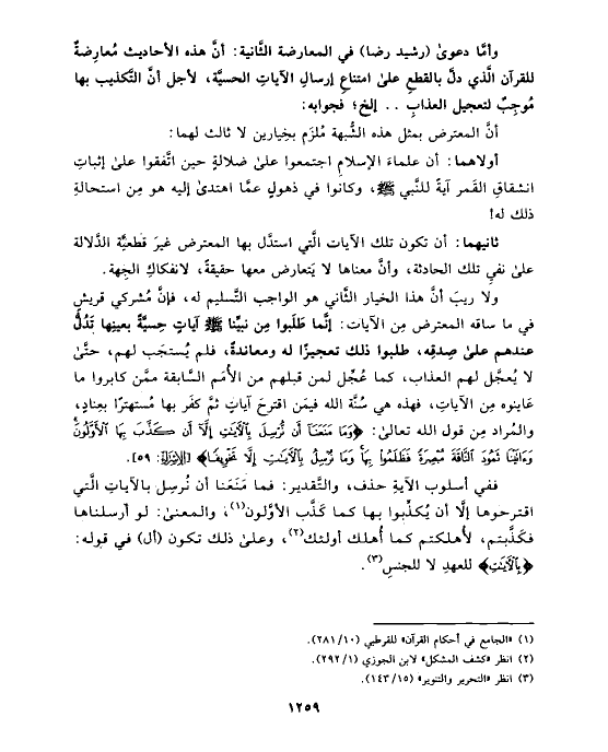 وأمَّا دعوى (رشيد رضا) في المعارضة الثَّانية: أنَّ هذه الأحاديث مُعارِضةٌ للقرآن الَّذي دلَّ بالقطعِ على امتناعِ إرسالِ الآياتِ الحسيَّة، لأجل أنَّ التَّكذيب بها مُوجِبٌ لتعجيل العذابِ .. إلخ؛ فجوابه: