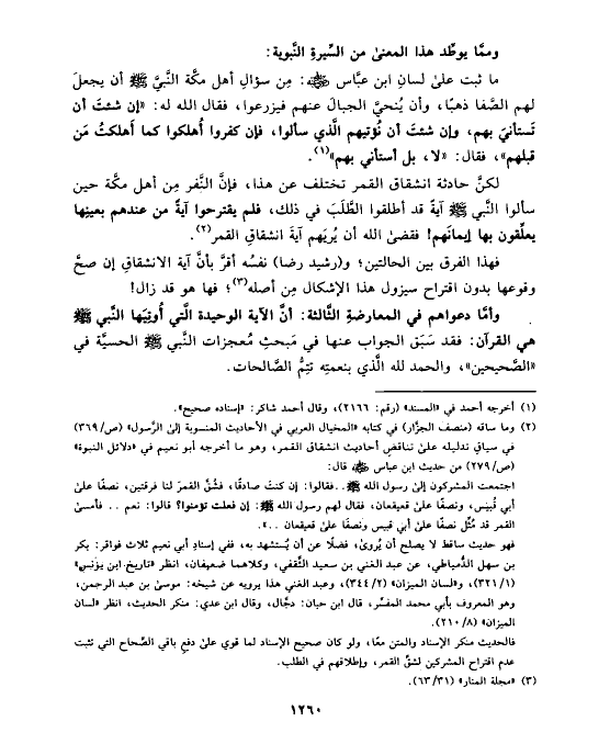 (¬٢) وما ساقه (منصف الجزَّار) في كتابه «المخيال العربي في الأحاديث المنسوبة إلى الرَّسول» (ص/٣٦٩) في سياقِ تدليله على تناقضِ أحاديث انشقاق القمر، وهو ما أخرجه أبو نعيم في «دلائل النبوة» (ص/٢٧٩) من حديث ابن عباس رضي الله عنه قال: