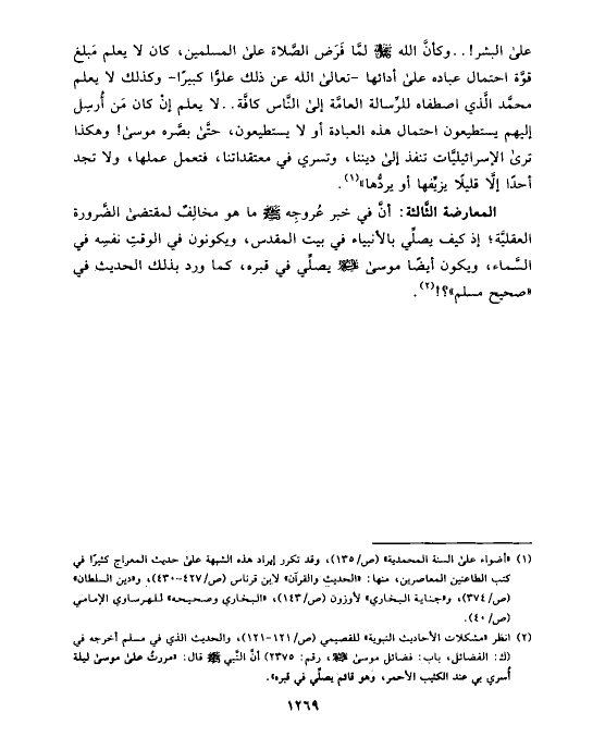 (¬٢) انظر «مشكلات الأحاديث النبوية» للقصيمي (ص/١٢١ - ١٢١)، والحديث الذي في مسلم أخرجه في (ك: الفضائل، باب: فضائل موسى عليه السلام، رقم: ٢٣٧٥) أنَّ النَّبي صلى الله عليه وسلم قال: «مررتُ على موسى ليلة أُسري بي عند الكثيب الأحمر، وهو قائم يصلِّي في قبره».