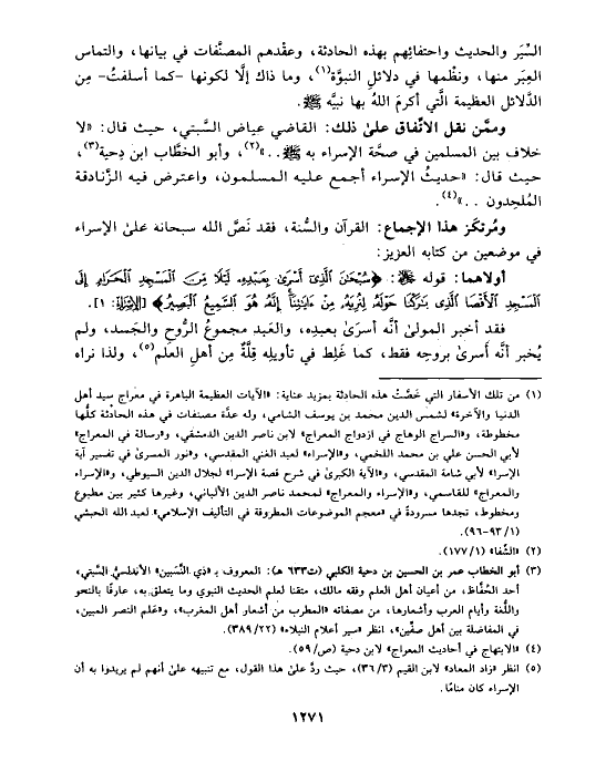وممَّن نقل الاتِّفاق على ذلك: القاضي عياض السَّبتي، حيث قال: «لا خلاف بين المسلمين في صحَّة الإسراء به صلى الله عليه وسلم .. » (¬٢)، وأبو الخطَّاب ابن دِحية (¬٣)، حيث قال: «حديثُ الإسراء أجمع عليه المسلمون، واعترض فيه الزَّنادقة المُلحِدون .. » (¬٤).