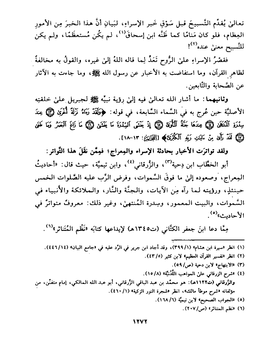 وابن تيميَّة، حيث قال: «أحاديثُ المِعراج، وصعوده إلى ما فوقَ السَّموات، وفرض الرَّب عليه الصَّلوات الخمس حينئذٍ، ورؤيته لما رآه مِن الآيات، والجنَّة والنَّار، والملائكة والأَنبياء في السَّموات، والبيت المعمور، وسِدرة المُنتهى، وغير ذلك: معروفٌ متواترٌ في الأحاديث» (¬٥).