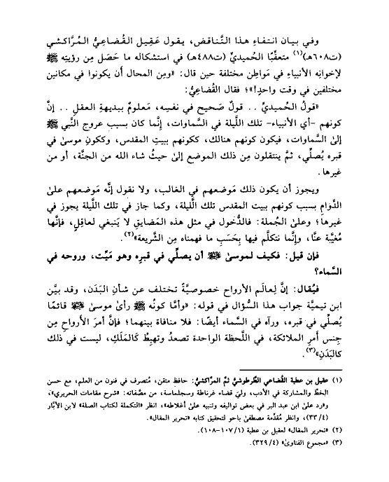 وفي بيان انتفاءِ هذا التَّناقض، يقول عَقِيل القُضاعِيُّ المُرَّاكشي (ت ٦٠٨ هـ) (¬١) متعقِّبًا الحُميديِّ (ت ٤٨٨ هـ) في استشكاله ما حَصَل مِن رؤيتِه صلى الله عليه وسلم لإخوانِه الأنبياءِ في مَواطِن مختلفة حين قال: «ومِن المحال أَن يكونوا في مكانين مختلفين في وقت واحدٍ!»؛ فقال القُضاعِيُّ: