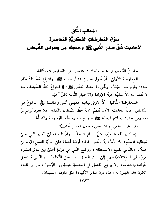 المعارضة الأولى: أنَّ قَبول حديثِ «شقِّ صدرِه صلى الله عليه وسلم، وانتزاعِ حَظِّ الشَّيطان منه»؛ يلزم منه الجَبْرُ، ونَفْي الاختيارِ للنَّبي صلى الله عليه وسلم؛ إذِ انتزاعُ حَظِّ الشَّيطان منه لا يُفهَم منه إلَاّ سَلبُ حريَّة الإرادةِ والاختيارِ الثَّابتة لكلِّ أحدٍ.