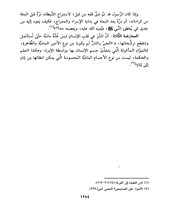 وإذا كان الرَّسول قد تمَّ شقُّ قلبه مِن قبل؛ لاستنزاعِ الشَّيطان مَرَّةً قبل البعثة من كراماته، أو مرَّةً بعد البعثة في بداية الإسراء والمعراج، فكيف يَعود إليه مِن جديدٍ كي يُخطئ النَّبي صلى الله عليه وسلم، فيُعينه الله عليه، ويَعصمه منه؟!» (¬١).