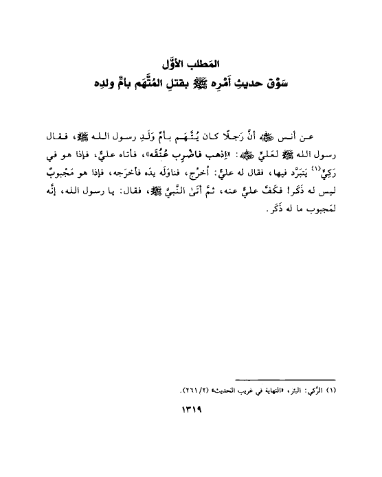 عن أنس رضي الله عنه أنَّ رَجلًا كان يُتَّهَم بأمِّ وَلَدِ رسول الله صلى الله عليه وسلم، فقال رسول الله صلى الله عليه وسلم لعَليٍّ رضي الله عنه: «اِذهب فاضْرِب عُنُقَه»، فأتاه عليٌّ، فإذا هو في رَكِيٍّ (¬١) يَتبَرَّد فيها، فقال له عليٌّ: اُخرُج، فناوَلَه يدَه فأخرَجه، فإذا هو مَجْبوبٌ ليس له ذَكَر! فكَفَّ عليٌّ عنه، ثمَّ أتَى النَّبيَّ صلى الله عليه وسلم، فقال: يا رسول الله، إنَّه لمَجبوب ما له ذَكَر.
