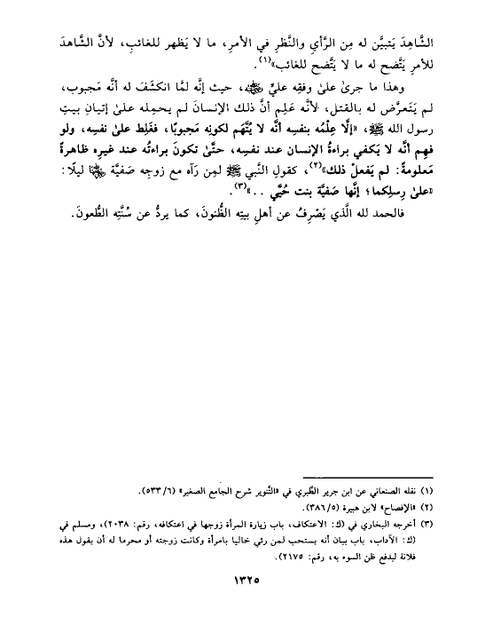 (¬٣) أخرجه البخاري في (ك: الاعتكاف، باب زيارة المرأة زوجها في اعتكافه، رقم: ٢٠٣٨)، ومسلم في (ك: الآداب، باب بيان أنه يستحب لمن رئي خاليا بامرأة وكانت زوجته أو محرما له أن يقول هذه فلانة ليدفع ظن السوء به، رقم: ٢١٧٥).