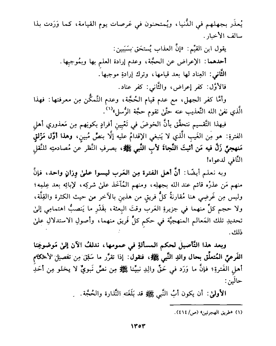 وبه نعلم أيضًا: أنَّ أهل الفترة مِن العَرب ليسوا على وِزانٍ واحد، فإنَّ منهم مَن عذرُه قائم عند الله بجهلِه، ومنهم المُآخَذ على شركِه، لإبائِه بعد عِلمِه؛ وليس مِن غَرضِي هنا مُقارنةُ كلُّ فريقٍ من هذينِ بالآخر من حيث الكثرة والقِلَّة، ولا حجم كلٍّ منهما في جزيرةِ العَرب وقتَ البِعثة، بقَدْرِ ما يَنصبُّ اهتمامِي إلى تحديدِ تلك المَعالم المنهجيَّة في حكمِ كلٍّ فَريق منهما، وأصولِ الاستدلالِ على ذلك.