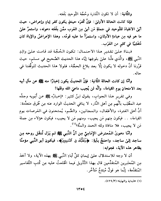 فبناءً على تقديرِ هذا الاحتمال: تكون الحُجَّة قد قامت على والِدِ النَّبي صلى الله عليه وسلم، والَّذي دلَّنا على بلوغِها إيَّاه هذا الحديث الصَّحيح في مسلمٍ، حيث قرَّرنا أنَّ دخوله لا يكون إلَّا بعد بلاغ الحجَّة، فلولا هذا الحديث لتَوقَّفنا في حاله.