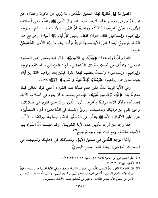 وفي الآية قرينة تدلُّ على عدم صحَّة هذا القول؛ أعني قوله تعالى قبله مقترنًا به: {الَّذِي يَرَاكَ حِينَ تَقُومُ}، فإنَّه لم يقصد به أن يقوم في أصلابِ الآباء إجماعًا، وأوَّل الآية مرتبطٌ بآخرها، أي: الَّذي يراك حين تقوم إلى صلاتِك، وحين تقوم من فراشِك ومجلسِك، ويرى وتقلبك في السَّاجدين، أي: المصلِّين، على أظهر الأقوال؛ لأنَّه صلى الله عليه وسلم يتقلَّب في المُصلِّين قائمًا، وساجدًا وراكعًا .. » (¬٢).