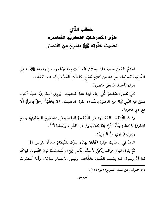 «في نفس الصَّفحةِ الَّتي جاء فيها هذا الحديث، يَروِي البخاريُّ حديثًا آخرَ، يَنهَى فيه النَّبي صلى الله عليه وسلم عن الخلوة بالنِّساء، يقول الحديث: «لا يخلُوَنَّ رجلٌ بامرأةٍ إلَّا مع ذي مَحرم».