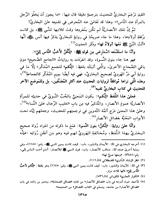 فعلى هذا اللَّفظ «إنَّكم»: يكون المَعنِيُّ بالحُبِّ النَّبويِّ في حديثِه للمرأةِ الأنصاريَّة عمومَ الأنصارِ، والتَّذكيرُ فيه مِن بابِ «تغليبِ الرِّجال على النِّساء» (¬٤)، وعلى هذا المعنى دَرَج أئمَّة التَّدوينِ في ترجمتِهم للحديث، وجعلهم إيَّاه تحت الأبوابِ المَعْنيَّة بفضائلِ الأنصارِ (¬٥).