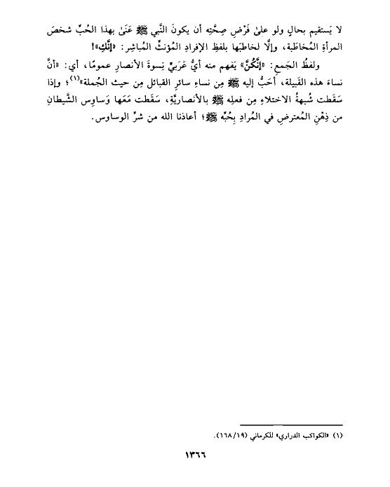 ولفظُ الجَمعِ: «إنَّكُنَّ» يَفهم منه أيُّ عَرَبيٍّ نِسوةَ الأنصارِ عمومًا، أي: «أنَّ نساءَ هذه القَبيلة، أحَبُّ إليه صلى الله عليه وسلم مِن نساءِ سائرِ القبائل مِن حيث الجُملة» (¬١)؛ وإذا سَقَطت شُبهةُ الاختلاءِ مِن فعلِه صلى الله عليه وسلم بالأنصاريَّةِ، سَقَطت مَعَها وَساوِس الشَّيطانِ من ذِهْنِ المُعترضِ في المُرادِ بِحُبِّه صلى الله عليه وسلم؛ أعاذنا الله من شرِّ الوساوس.
