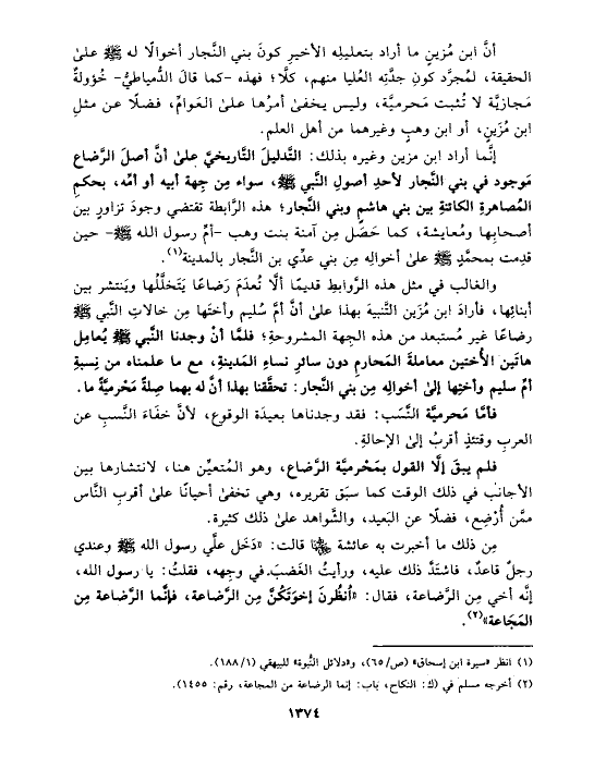 إنَّما أراد ابن مزين وغيره بذلك: التَّدليلَ التَّاريخيَّ على أنَّ أصلَ الرَّضاع مَوجود في بني النَّجار لأحدِ أصولِ النَّبي صلى الله عليه وسلم، سواء مِن جِهة أبيه أو أمِّه، بحكمِ المُصاهرةِ الكائنةِ بين بني هاشمٍ وبني النَّجار؛ هذه الرَّابطة تقتضي وجودَ تزاورٍ بين أصحابِها ومُعايشة، كما حَصَل مِن آمنة بنت وهب -أمِّ رسول الله صلى الله عليه وسلم- حين قدِمت بمحمَّدٍ صلى الله عليه وسلم على أخوالِه مِن بني عدِّي بن النَّجار بالمدينة (¬١).