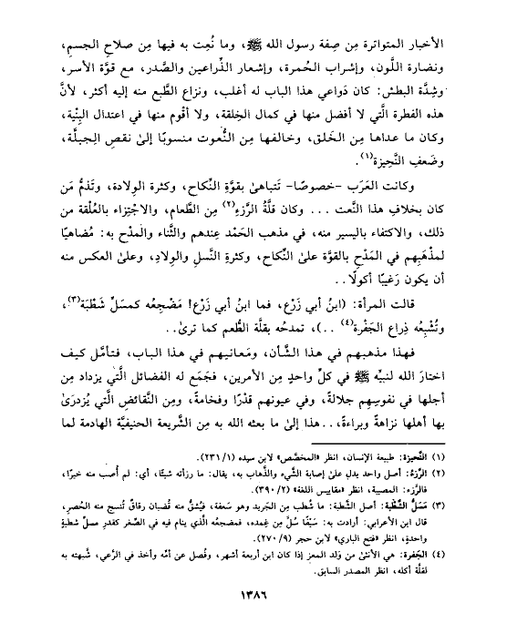 الأخبار المتواترة مِن صِفة رسول الله صلى الله عليه وسلم، وما نُعِت به فيها مِن صلاحِ الجسمِ، ونضارة اللَّون، وإشراب الحُمرة، وإشعار الذِّراعين والصَّدر، مع قوَّة الأسر، وشِدَّة البطش: كان دَواعي هذا الباب له أغلب، ونزاع الطَّبع منه إليه أكثر، لأنَّ هذه الفطرة الَّتي لا أفضل منها في كمال الخِلقة، ولا أقْوم منها في اعتدال البِنْية، وكان ما عداها مِن الخَلق، وخالفها مِن النُّعوت منسوبًا إلى نقصِ الِجبلَّة، وضَعفِ النَّحِيزة (¬١).