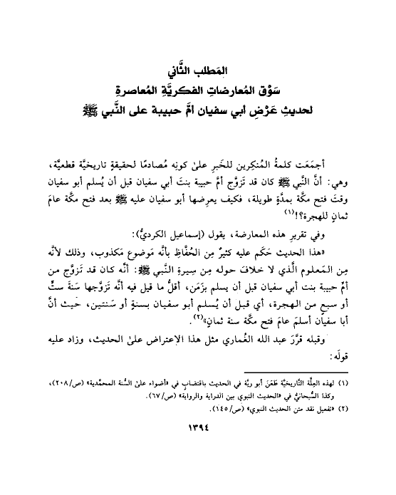 «هذا الحديث حَكَم عليه كثيرٌ مِن الحُفَّاظِ بأنَّه مَوضوع مَكذوب، وذلك لأنَّه مِن المَعلوم الَّذي لا خلافَ حوله مِن سِيرةِ النَّبي صلى الله عليه وسلم: أنَّه كان قد تَزوَّج من أمِّ حبيبة بنت أبي سفيان قبل أن يسلم بزَمَن، أقلُّ ما قيل فيه أنَّه تَزوَّجها سَنةَ ستٍّ أو سبعٍ من الهجرة، أي قبل أن يُسلم أبو سفيان بسنةٍ أو سَنتين، حيث أنَّ أبا سفيان أسلمَ عامَ فتح مكَّة سنة ثمانٍ» (¬٢).