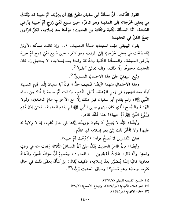وهذا الاحتمالِ منهما «أيضًا ضَعيف جدًّا؛ فإنَّ أبا سفيان إنَّما قَدِم المدينة آمِنًا بعد الهجرةِ في زمنِ الهُدنة، قُبَيل الفَتح، وكانت أمُّ حبيبة إذ ذَّاك مِن نساء النَّبي صلى الله عليه وسلم، ولم يَقدم أبو سفيان قبل ذلك إلَّا مع الأحزابِ عامَ الخندق، ولولا الهُدنة والصُّلح الَّذي كان بينهم وبين النَّبي صلى الله عليه وسلم لم يقدم المدينة، فمتى إذن قَدِم وزَوَّجَ النَّبيَّ صلى الله عليه وسلم أمَّ حبيبة؟! هذا غَلَطٌ ظاهر.