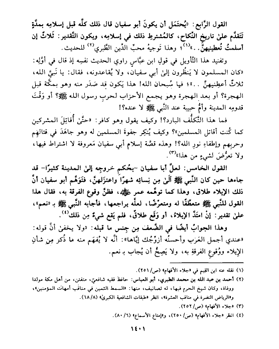القول الرَّابع: «يُحتَمَل أن يكونَ أبو سفيان قال ذلك كلَّه قبل إسلامِه بمدَّةٍ تَتَقدَّم على تاريخِ النِّكاح، كالمُشترطِ ذلك في إسلامِه، ويكون التَّقدير: ثَلاثٌ إن أسلمتُ تُعطينيهنَّ .. » (¬١)؛ وهذا تَوجيهُ محبِّ الدِّين الطَّبري (¬٢) للحديث.