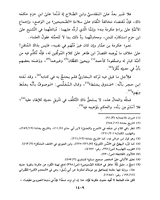 فلا ضَير بعدُ على المَقدسيِّ وابنِ الصَّلاح إذ شَنَّعا على ابنِ حزم حكمَه ذاك، فإنَّ مُقتضاه مخالفةَ النُّقادِ على سلامةِ «الصَّحيحين» مِن الوَضعِ، وإجماعِ الأئمَّةِ على براءةِ عكرمةَ مِنه؛ وإنمَّا الَّذي أردُّه عليهما: مُبالغتُهما في التَّشنيع على ابن حزمٍ استنكارَه للمتنِ، ومحاولتُهما ردَّ ذلك بما لا تَتَحمَّله عقولُ العلماء.