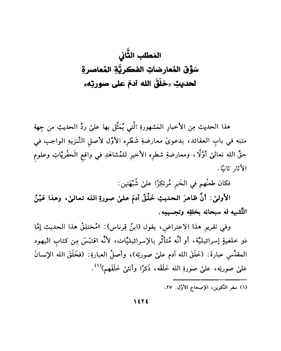الأولى: أنَّ ظاهرَ الحديثِ خَلْقُ آدمَ على صورةِ الله تعالى، وهذا عَيْنُ التَّشبيه له سبحانه بخلقِه وتجسيمِه.