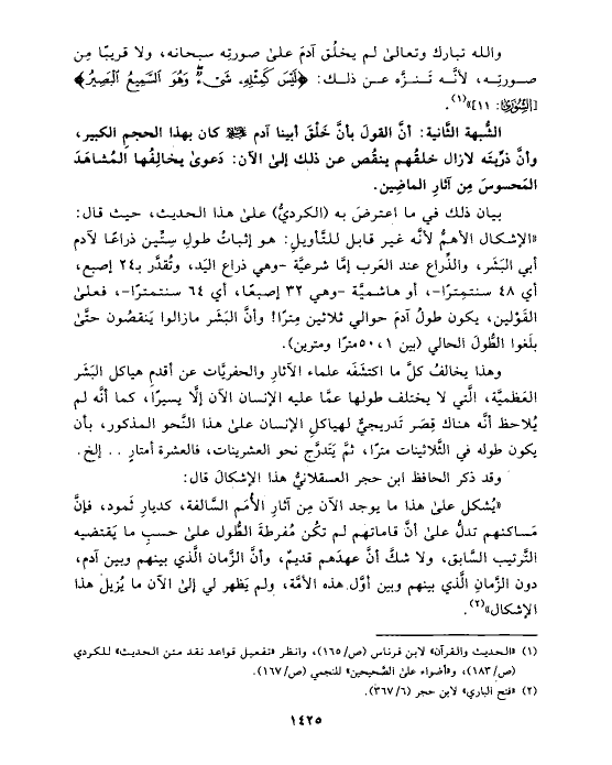 بيان ذلك في ما اعترضَ به (الكرديُّ) على هذا الحديث، حيث قال: «الإشكال الأهمُّ لأنَّه غير قابل للتَّأويلِ: هو إثباتُ طولِ سِتِّين ذراعًا لآدم أبي البَشَر، والذِّراع عند العَرب إمَّا شرعيَّة -وهي ذراع اليَد، وتُقدَّر بـ ٢٤ إصبع، أي ٤٨ سنتمِترًا-، أو هاشميَّة -وهي ٣٢ إصبعًا، أي ٦٤ سنتمترًا-، فعلى القَوْلين، يكون طولُ آدمَ حوالي ثلاثين مِترًا! وأنَّ البَشَر مازالوا يَنقصُون حتَّى بلَغوا الطُّولَ الحالي (بين ١،٥٠ مترًا ومترين).