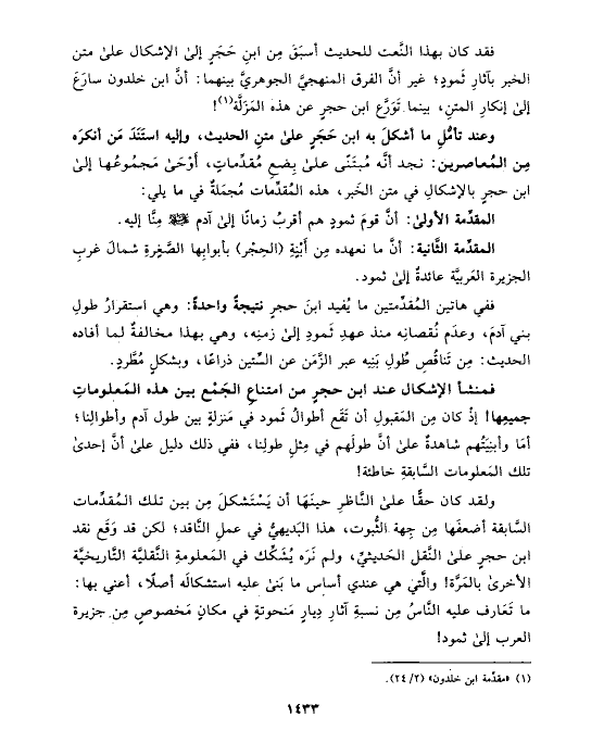 فقد كان بهذا النَّعت للحديث أسبَقَ مِن ابنِ حَجَرٍ إلى الإشكال على متن الخبر بآثارِ ثَمودٍ؛ غير أنَّ الفرق المنهجيَّ الجوهريَّ بينهما: أنَّ ابن خلدون سارَعَ إلى إنكارِ المتنِ، بينما تَوَرَّع ابن حجرٍ عن هذه المَزَلَّة (¬١)!