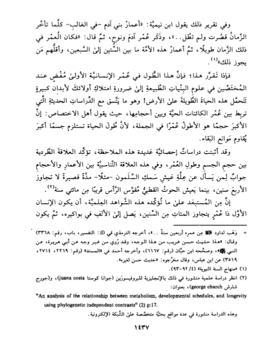 وقد أثبتت دراساتٌ إحصائيَّة عَديدة هذه الملاحظة، تؤكِّد العلاقةَ الطَّردية بين حجمِ الجسمِ وطولِ العُمْر، وفي هذه العلاقة التَّناسبيَّة بين الأعمارِ والأحجامِ جوابٌ لِمن يَسأل عن عِلَّةِ عَيشِ سَمكِ السَّلَمون -مثلًا- مدَّةً قصيرةً لا تجاوز الأربعَ سنين، بينما يَعيش الحوتُ القطبيُّ مُقوَّس الرَّأس قريبًا مِن مائتي سنة (¬٢).