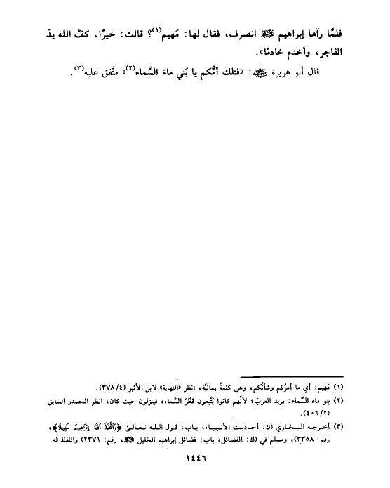 فلمَّا رآها إبراهيم عليه السلام انصرف، فقال لها: مَهيم (¬١)؟ قالت: خيرًا، كفَّ الله يدَ الفاجر، وأخدم خادمًا».