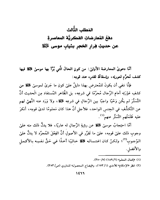 أمَّا دعوى المعارضة الأولى: من كونِ الحالَ الَّتي بُرِّأ بها موسى عليه السلام فيها كشف مُحرَّم لعورتِه، وإسقاطٌ لقدرِه عند قومِه: