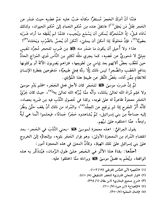 ثمَّ إنَّ ضربَ موسى عليه السلام للحَجَرِ كان لأجلِ فعلِ الحَجَر، «فلم يَدْرِ موسى ولا عَلِم مُرادَ الله تعالى بذلك، وأنَّه ممَّا يُبَرِّئه الله تعالى به» (¬٤)، حيث كان جَرْيُ الحَجَرِ معجزةً ظاهرةً له على قومِه، وكذا في حُصولِ النَّدْبِ فيه مِن ضَربِه بعصاه، كأنَّه أَثَرُ الجَرحِ إذا لم يَرتفِع عن الجِلْد (¬٥)؛ والمُراد من ذلك أنْ يقف حتَّى ينظُرَ إليه جماعةٌ مِن بني إسرائيل، ثمَّ يُشاهدوه حَجَرًا جَمادًا، فيعلموا أنَّما هي آيةٌ رادِعةٌ، عمَّا اختلقوه على نبيِّهم.