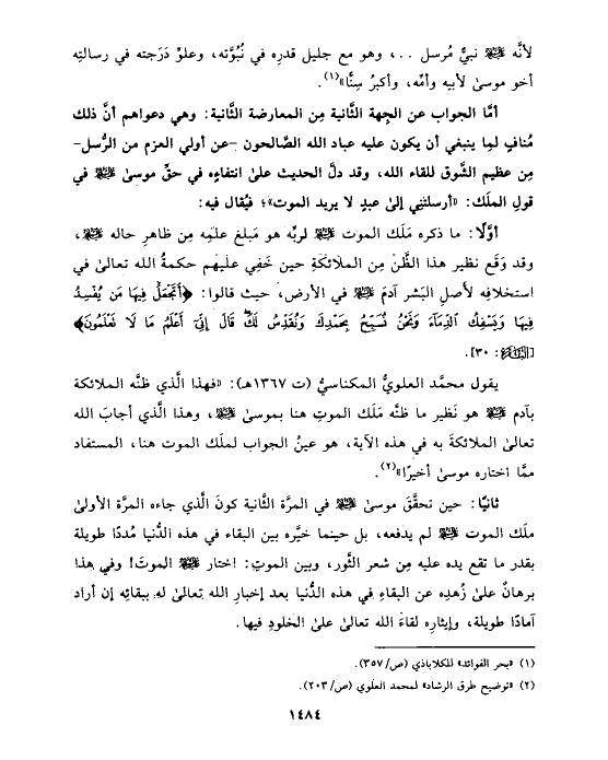 يقول محمَّد العلويُّ المكناسيُّ (ت ١٣٦٧ هـ): «فهذا الَّذي ظنَّه الملائكة بآدم عليه السلام هو نَظير ما ظنَّه مَلَك الموتِ هنا بموسى عليه السلام، وهذا الَّذي أجابَ الله تعالى الملائكةَ به في هذه الآية، هو عينُ الجواب لملَك الموت هنا، المستفاد ممَّا اختاره موسى أخيرًا» (¬٢).