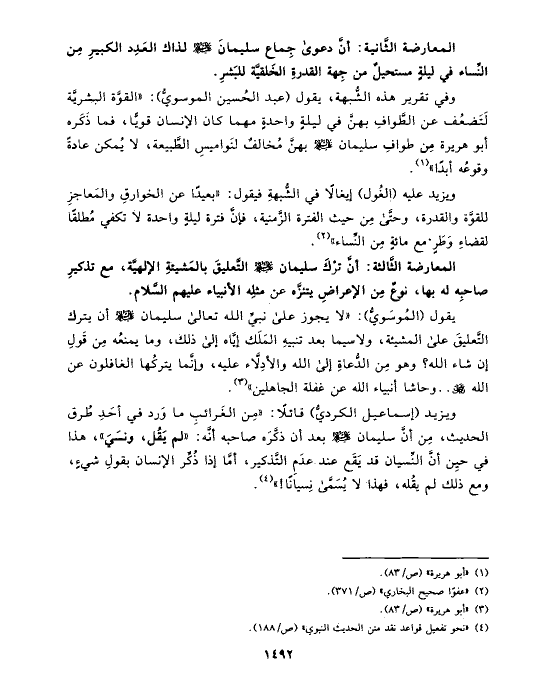 ويزيد (إسماعيل الكرديُّ) قائلًا: «مِن الغَرائبِ ما وَرد في أحَدِ طُرق الحديث، مِن أنَّ سليمان عليه السلام بعد أن ذكَّرَه صاحبه أنَّه: «لم يَقُل، ونسَيَ»، هذا في حيِن أنَّ النِّسيان قد يَقَع عند عدَمِ التَّذكير، أمَّا إذا ذُكِّر الإنسان بقولِ شيءٍ، ومع ذلك لم يقُله، فهذا لا يُسَمَّى نِسيانًا!» (¬٤).