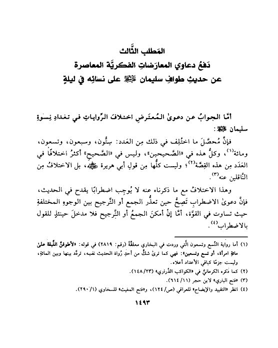 (¬١) أما رواية التِّسع وتسعون الَّتي وردت في البخاري معلقَّةً (رقم: ٢٨١٩) في قوله: «لأطوفنَّ اللَّيلة على مائةِ امرأة، أو تسع وتسعين»: فهي كما ترى شكٌّ من أحدِ رُواة الحديث نفسِه، تردَّد بينها وبين المائةِ، وليست جزمًا كباقي الأعداد أعلاه.
