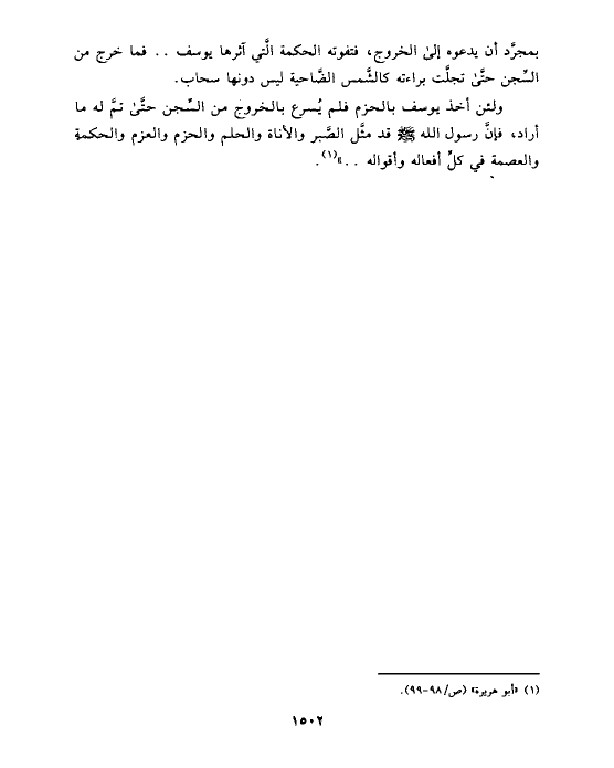 ولئن أخذ يوسف بالحزم فلم يُسرع بالخروج من السِّجن حتَّى تمَّ له ما أراد، فإنَّ رسول الله صلى الله عليه وسلم قد مثَّل الصَّبر والأناة والحلم والحزم والعزم والحكمة والعصمة في كلِّ أفعاله وأقواله .. » (¬١).