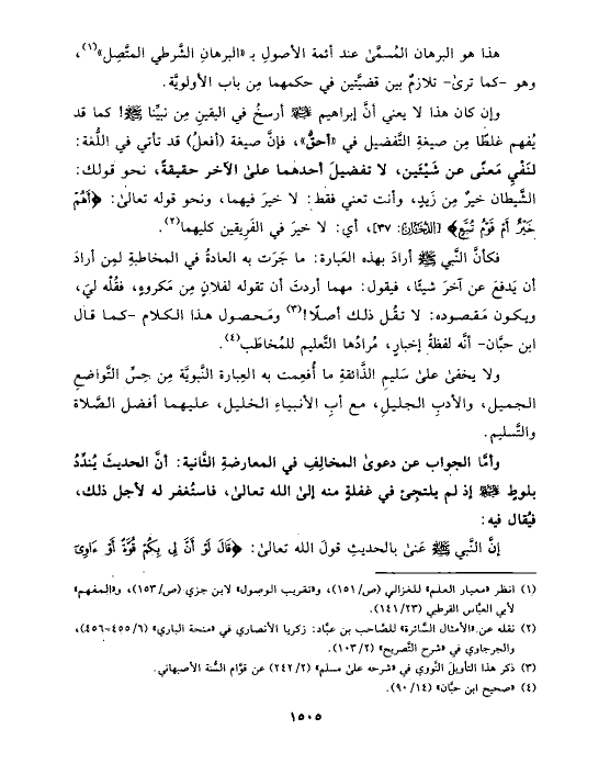 وإن كان هذا لا يعني أنَّ إبراهيم عليه السلام أرسخُ في اليقينِ مِن نبيِّنا صلى الله عليه وسلم! كما قد يُفهم غلطًا مِن صيغةِ التَّفضيل في «أحقُّ»، فإنَّ صيغة (أفعلُ) قد تأتي في اللُّغة: لنَفْيِ مَعنًى عن شَيْئَين، لا تفضيلَ أحدهما على الآخر حقيقةً، نحو قولك: الشَّيطان خيرٌ مِن زَيدٍ، وأنت تعني فقط: لا خيرَ فيهما، ونحو قوله تعالى: {أَهُمْ خَيْرٌ أَمْ قَوْمُ تُبَّعٍ} [الدخان: ٣٧]، أي: لا خيرَ في الفَرِيقين كليهما (¬٢).