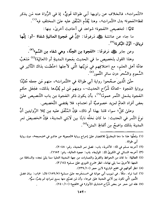 وهذا القول بتَخصيصِ ما في الحديث بعَجوة المدينةِ أو (العالِيَة) (¬٤) مَذهبُ عامَّة أهل العلمِ، مع اختلافِهم في مَزِيَّتها الَّتي لأجلها اختُصَّت بذاك التَّأثير في السُّموم والسِّحر دون سائرِ التَّمور (¬٥).