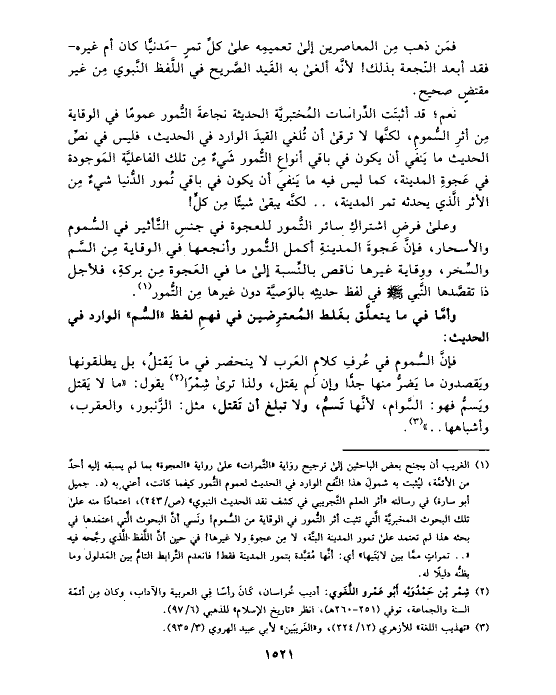 (¬١) الغريب أن يجنح بعض الباحثين إلى ترجيح رواية «التَّمرات» على رواية «العجوة» بما لم يسبقه إليه أحدٌ من الأئمَّة، ليُثبت به شمولَ هذا النَّفع الوارد في الحديث لعموم التُّمور كيفما كانت، أعني به (د. جميل أبو سارة) في رسالته «أثر العلم التَّجريبي في كشف نقد الحديث النبوي» (ص/٢٤٣)، اعتمادًا منه على تلك البحوث المخبريَّة الَّتي تثبت أثر التُّمور في الوقاية من السُّموم! ونَسي أنَّ البحوث الَّتي اعتمدها في بحثه هذا لم تعتمد على تمور المدينة البتَّة، لا مِن عجوة ولا غيرها! في حين أنَّ اللَّفظ الَّذي رجَّحه فيه « .. تمراتٍ ممَّا بين لابَتَيها» أي: أنَّها مُقيَّدة بتمور المدينة فقط! فانعدم التَّرابط التامُّ بين المَدلول وما يظنُّه دليلًا له.