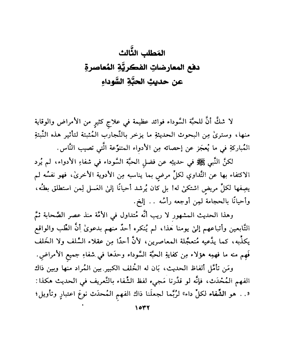 وهذا الحديث المشهور لا ريب أنَّه مُتداول في الأمَّة منذ عصر الصَّحابة ثمَّ التَّابعين وأتباعهم إلى يومنا هذا، لم يُنكره أحدٌ منهم بدعوى أنَّ الطِّب والواقع يكذِّبه، كما يدَّعيه مُتعجِّلة المعاصرين، لأنَّ أحدًا مِن عقلاء السَّلف ولا الخَلف فَهِم منه ما فهمِه هؤلاء مِن كفايةِ الحبَّة السَّوداء وحدَها في شفاءِ جميعِ الأمراضِ.